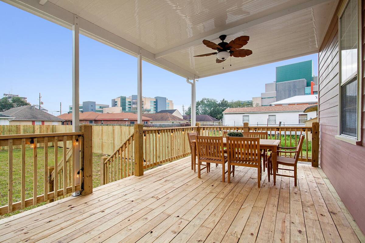 Great location! The location was within 10 to 20 minutes of Bourbon St, French Qaurters, and several other NOLA attractions. The neighborhood isn’t bad at all and the neighbors were really friendly and helpful. The backyard was fenced in with a privacy fence. The covered deck was great for our family. Even with it raining we sat outside and enjoyed a meal together. The house is spacious and the doors all close off for privacy.