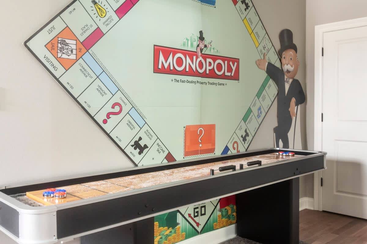 Game room: Full sized arcade game with 65 awesome games, Full sized shuffle board table, Family friendly token slot machine & Oversized wall connect 4. Fun for all ages to enjoy!